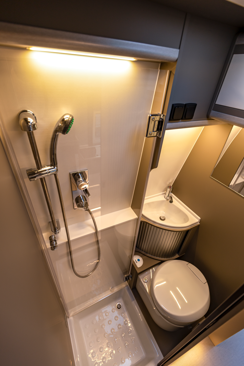 • EXTRA großes, patentiertes Komfort-Bad mit schwenkbarer Acrylglastüre zum Abtrennen der Dusche – robust, pflegeleicht und funktionell