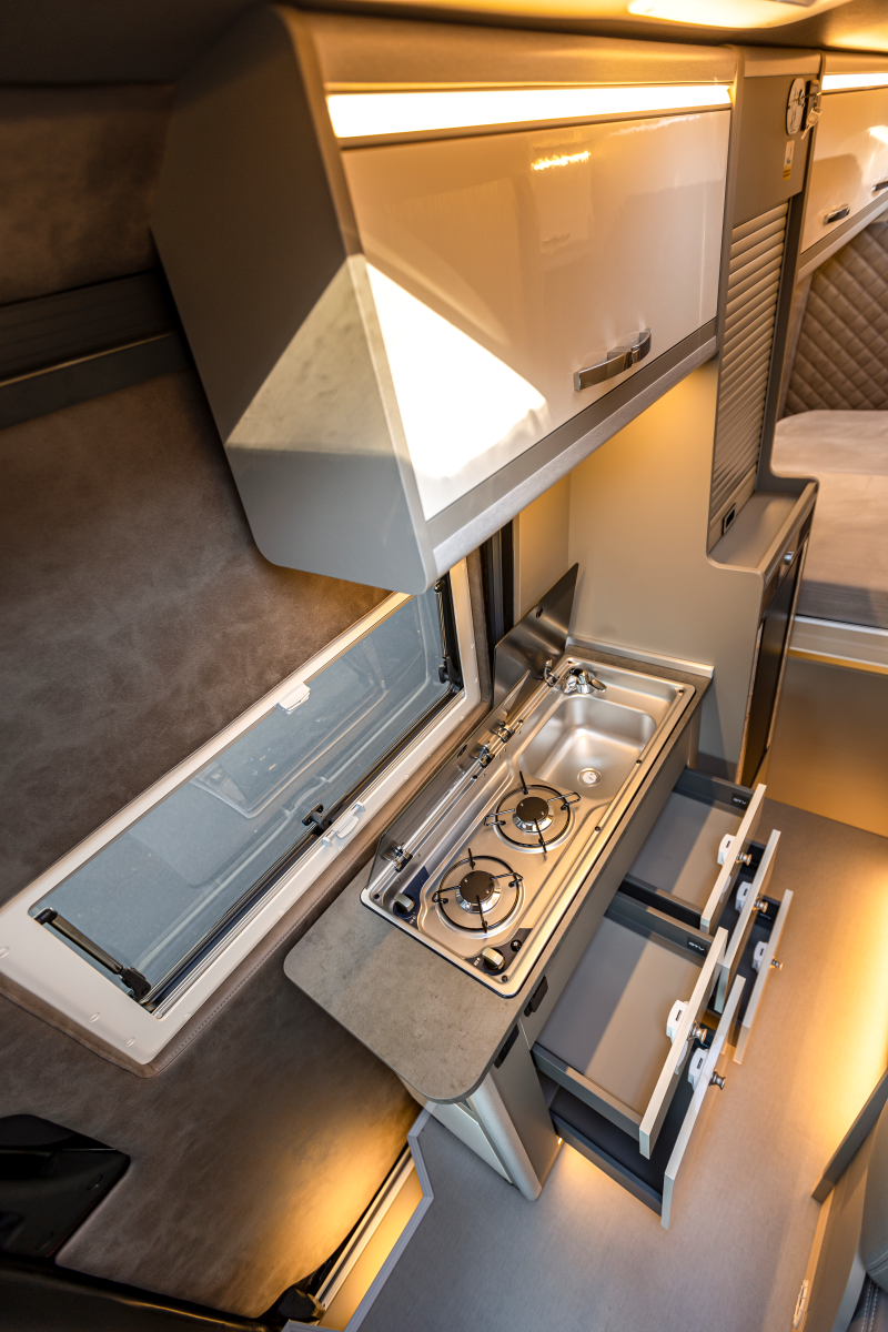 • Frischwassertank 80 Liter (+10 L Boiler) mit hochwertiger Wasserdruck-Ausgleichspumpe