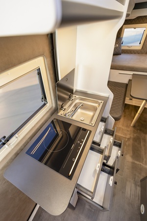 - Frischwassertank 80 Liter (+10 L Boiler) mit hochwertiger Wasserdruck-Ausgleichspumpe
