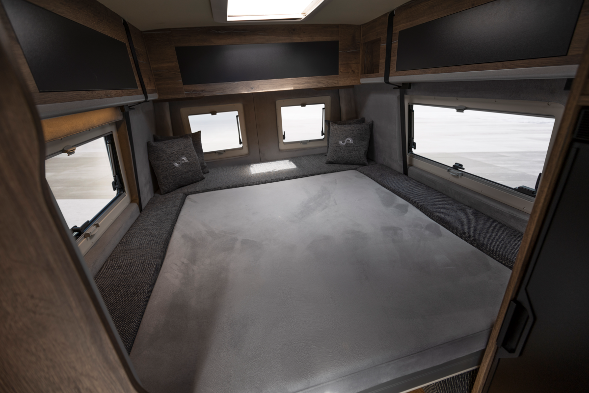 Der Lounge Twin ist für zwei konzipiert er bietet eine geräumige Küche, ein großes Bad und das XL-Hubbett über der vielseitigen Hecklounge.